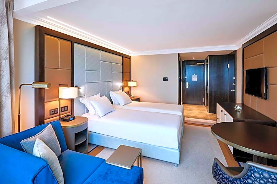 This room features a spacious marble bathroom with a bathtub and a separate walk-in shower. Additional features of this room are a 55-inch HDTV, Nespresso coffee machine, bedside USB ports, a multimedia hub, heatable mirrors in the bathroom and safety night lights.